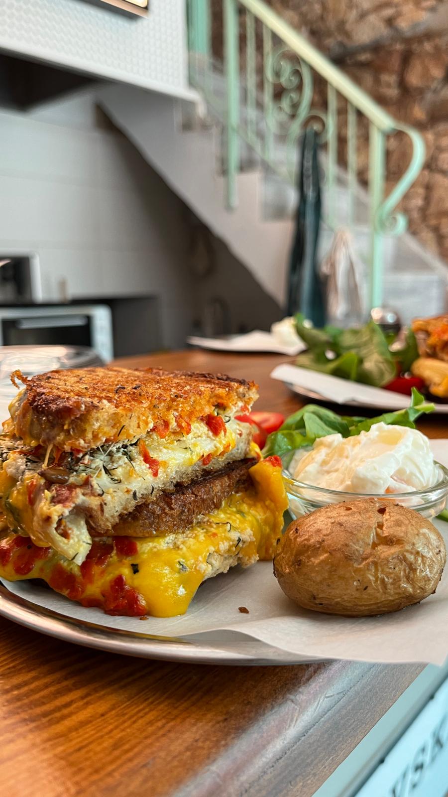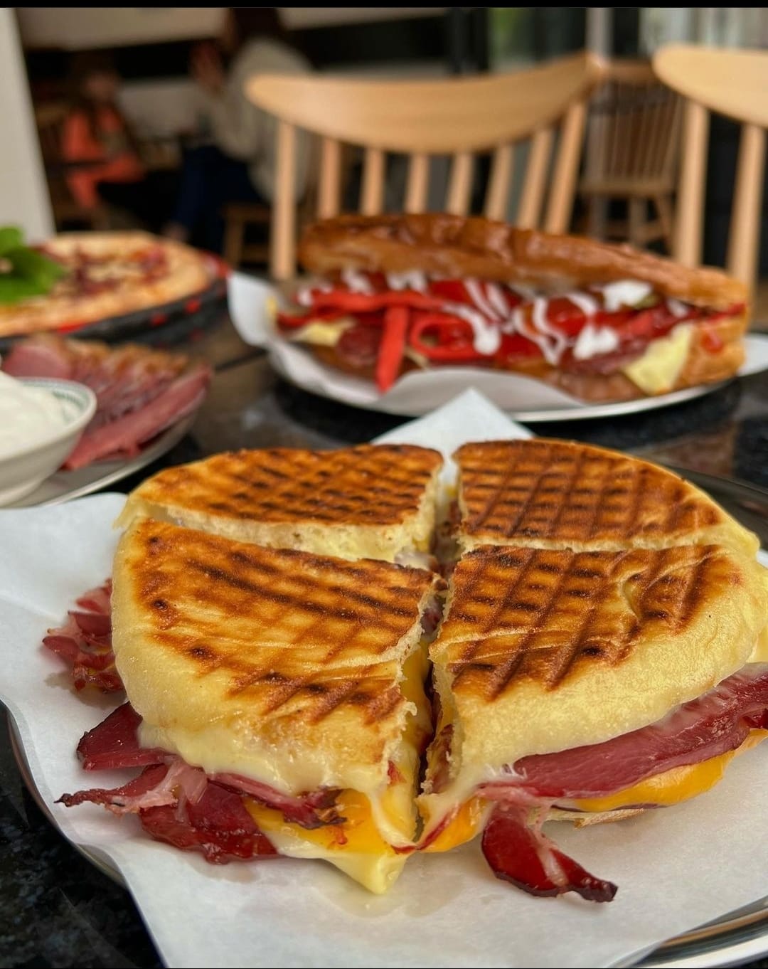Tereyagi ile yaglanmis bazlama ekmeginde ajvar sos, kasar peyniri, isli sucuk, antrikot kuru et, cheddar peyniri, yaninda firinlanmis baby patates ve somborka soka (kaymakli biber)