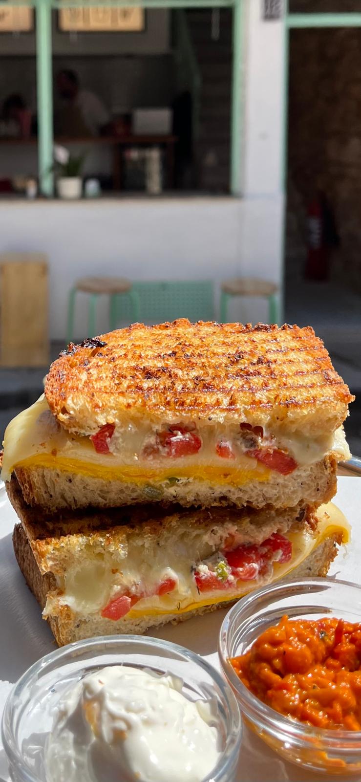 Tereyagi ile yaglanmis bazlama ekmeginde ajvar sos, kasar peyniri, isli sucuk, antrikot kuru et, cheddar peyniri, yaninda firinlanmis baby patates ve somborka soka (kaymakli biber)