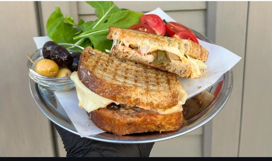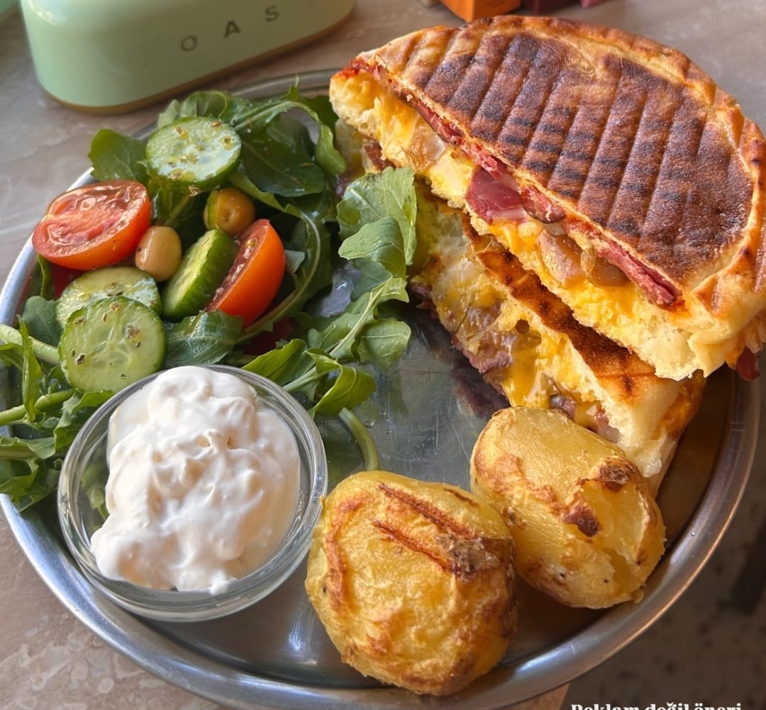 Tereyag ile yaglanmis ekmege, antrikot kuru et, karamelize sogan, cheddar peyniri, kasar peyniri, ajvar sos (köz kapya biber ile) yaninda soka patates ve mini salata
